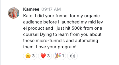 “That was my first 6-figure year, and now that same funnel has brought in multi 6-figures every year since (and we are so close to hitting 7-figures). My whole business is now automated. Kate was my secret weapon!"