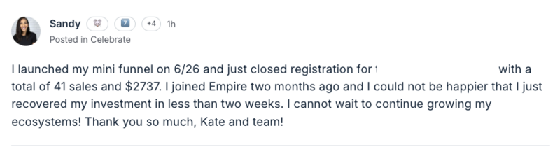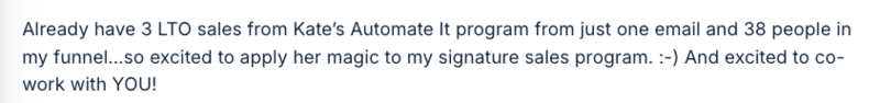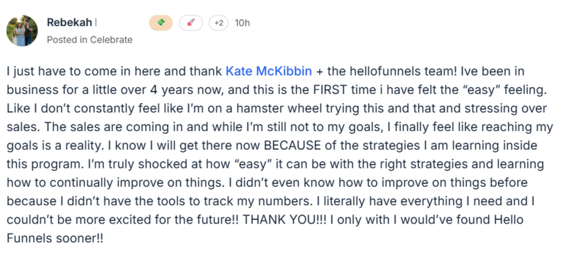 "11 days ago I joined this program, and today we presented our FIRST ever funnel friendly offer using the Hello Funnels system and TA-DAA... $9100 revenue generated. Thank you for being awesome Kate! #evergreenherewecome #weheartkate" - Bianca