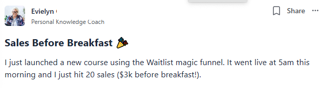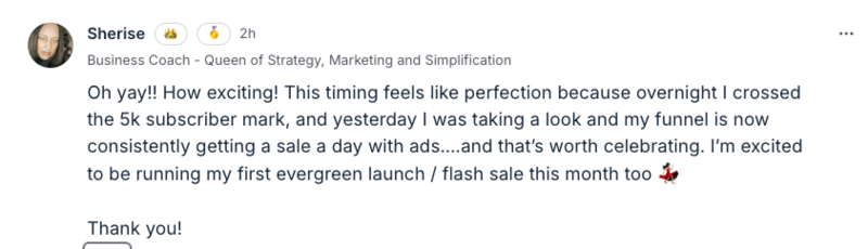 ”Kate, we've just hit $60K this month from a combination of launching and evergreen. Your strategies are killing it for us - evergreen in particular!"